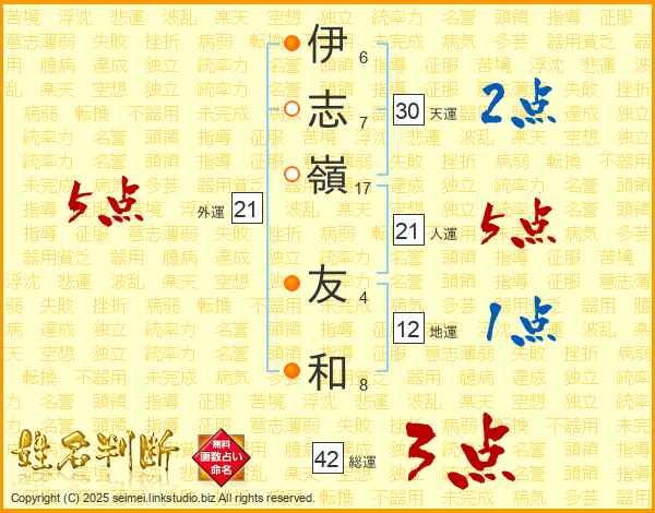 伊(6画)志(7画)嶺(17画) 友(4画)和(8画)