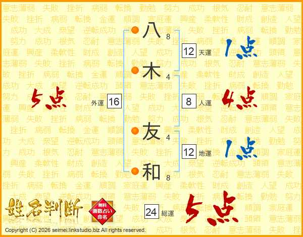 生活面を象徴する運勢です。外部から受ける影響力を表し、結婚運、家庭運や職場、環境への順応性を表します。総運から人運を引いた画数。姓や名が1文字の場合を除く。