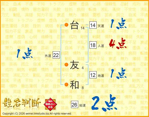 生活面を象徴する運勢です。外部から受ける影響力を表し、結婚運、家庭運や職場、環境への順応性を表します。総運から人運を引いた画数。姓や名が1文字の場合を除く。