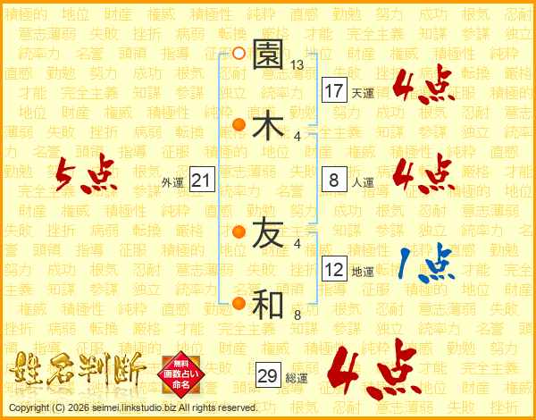 園(13画)木(4画) 友(4画)和(8画)