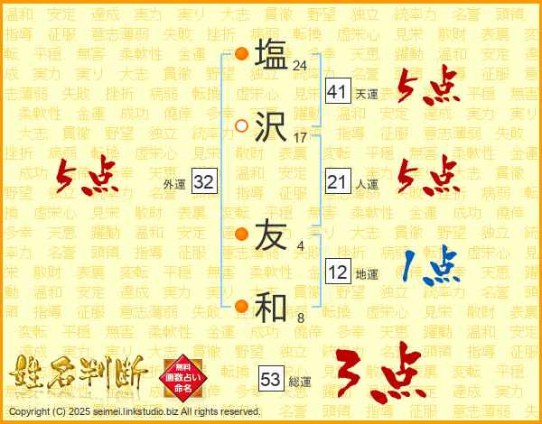 生活面を象徴する運勢です。外部から受ける影響力を表し、結婚運、家庭運や職場、環境への順応性を表します。総運から人運を引いた画数。姓や名が1文字の場合を除く。