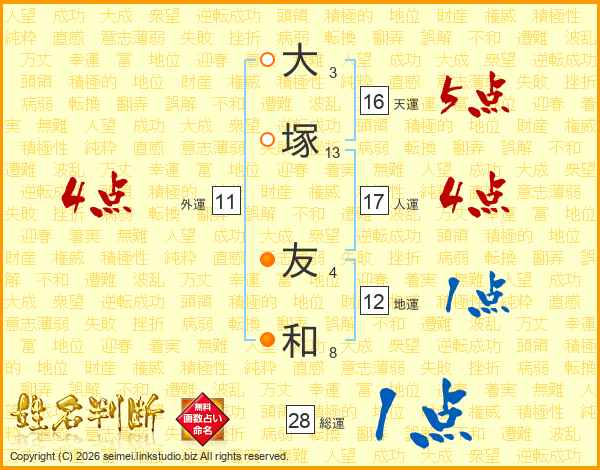 あなたの人生を表す1番重要な運勢です。生涯を通じて影響する総合運となり、主に50歳以降の晩年期に影響を及ぼします。苗字と名前の合計画数。
