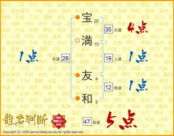 生活面を象徴する運勢です。外部から受ける影響力を表し、結婚運、家庭運や職場、環境への順応性を表します。総運から人運を引いた画数。姓や名が1文字の場合を除く。