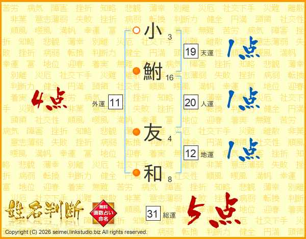 生活面を象徴する運勢です。外部から受ける影響力を表し、結婚運、家庭運や職場、環境への順応性を表します。総運から人運を引いた画数。姓や名が1文字の場合を除く。
