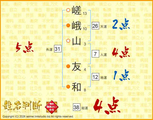 嵯峨山友和さんの総運は38画の4点!