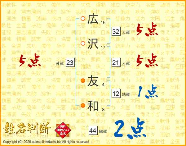 広沢友和さんの総運は44画の2点!