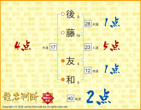 生活面を象徴する運勢です。外部から受ける影響力を表し、結婚運、家庭運や職場、環境への順応性を表します。総運から人運を引いた画数。姓や名が1文字の場合を除く。
