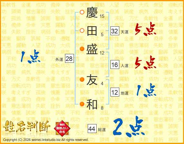 慶(15画)田(5画)盛(12画) 友(4画)和(8画)