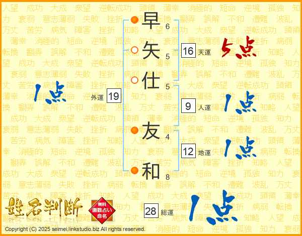 早(6画)矢(5画)仕(5画) 友(4画)和(8画)