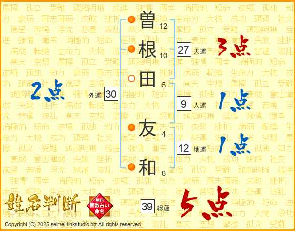 曽(12画)根(10画)田(5画) 友(4画)和(8画)