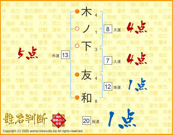 木ノ下友和さんの人運は7画の4点!