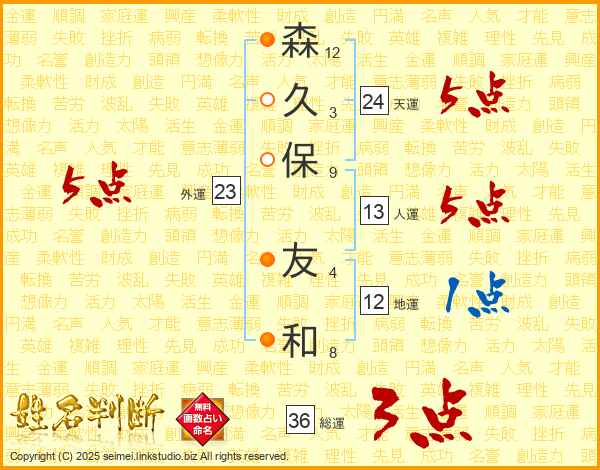 森(12画)久(3画)保(9画) 友(4画)和(8画)