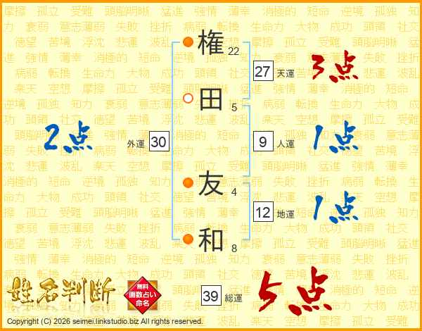 生活面を象徴する運勢です。外部から受ける影響力を表し、結婚運、家庭運や職場、環境への順応性を表します。総運から人運を引いた画数。姓や名が1文字の場合を除く。