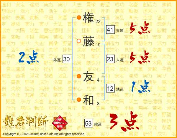権(22画)藤(19画) 友(4画)和(8画)