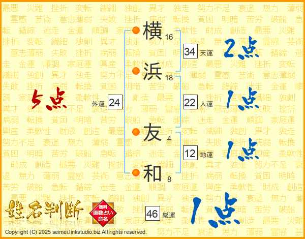 生活面を象徴する運勢です。外部から受ける影響力を表し、結婚運、家庭運や職場、環境への順応性を表します。総運から人運を引いた画数。姓や名が1文字の場合を除く。