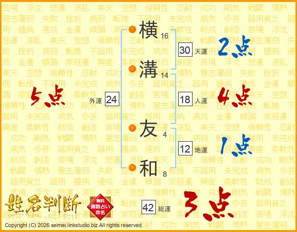 生活面を象徴する運勢です。外部から受ける影響力を表し、結婚運、家庭運や職場、環境への順応性を表します。総運から人運を引いた画数。姓や名が1文字の場合を除く。