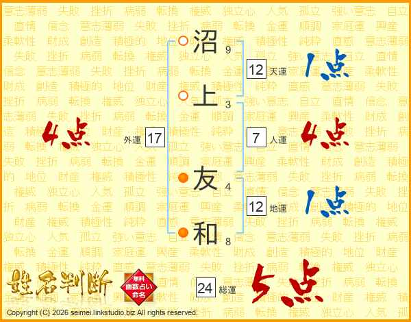 沼上友和さんの総運は24画の5点!