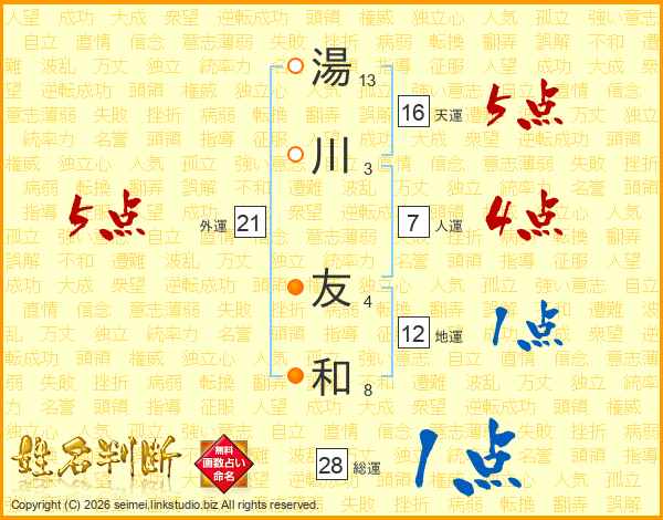 生活面を象徴する運勢です。外部から受ける影響力を表し、結婚運、家庭運や職場、環境への順応性を表します。総運から人運を引いた画数。姓や名が1文字の場合を除く。