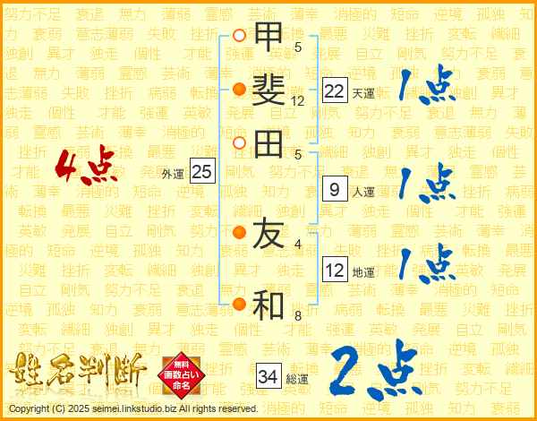甲(5画)斐(12画)田(5画) 友(4画)和(8画)