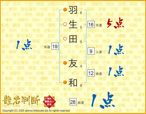 羽(6画)生(5画)田(5画) 友(4画)和(8画)
