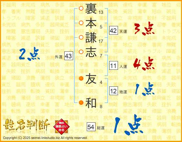 裏本謙志友和さんの人運は11画の4点!