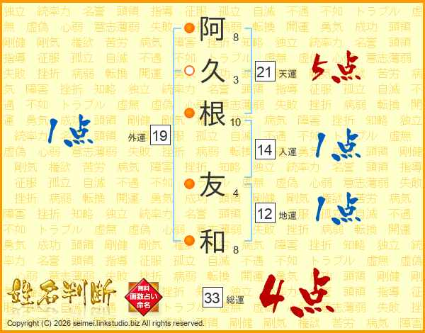 阿(8画)久(3画)根(10画) 友(4画)和(8画)