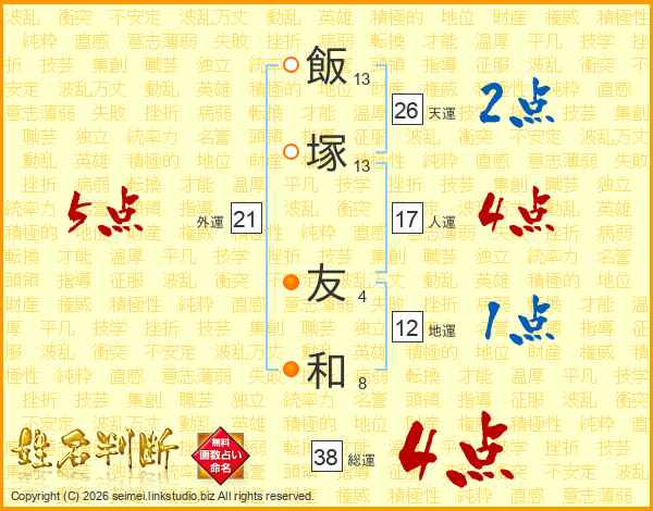 飯(13画)塚(13画) 友(4画)和(8画)