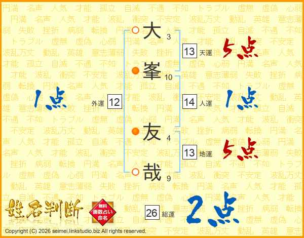 大峯友哉さんの天運は13画の5点!