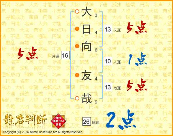 大(3画)日(4画)向(6画) 友(4画)哉(9画)