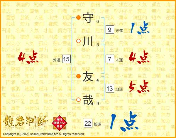 守(6画)川(3画) 友(4画)哉(9画)
