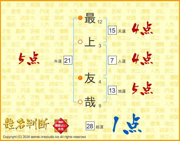 生活面を象徴する運勢です。外部から受ける影響力を表し、結婚運、家庭運や職場、環境への順応性を表します。総運から人運を引いた画数。姓や名が1文字の場合を除く。