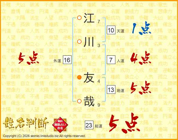 江川友哉さんの総運は23画の5点!