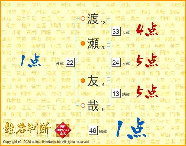 渡(13画)瀬(20画) 友(4画)哉(9画)
