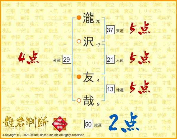 瀧沢友哉さんの天運は37画の5点!