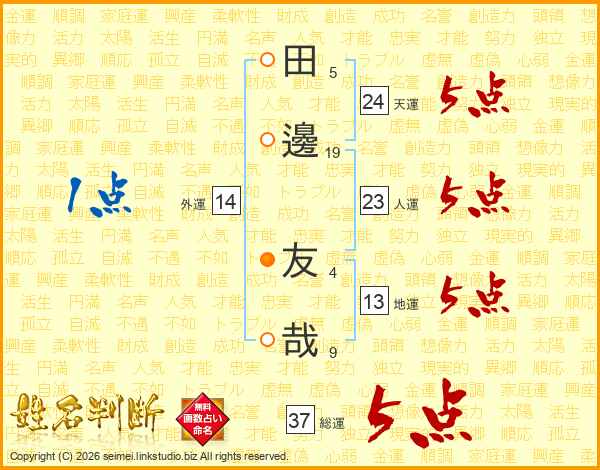 田(5画)邊(19画) 友(4画)哉(9画)