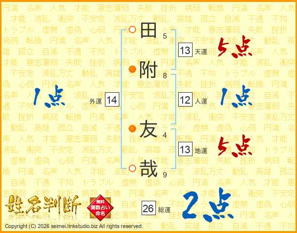 生活面を象徴する運勢です。外部から受ける影響力を表し、結婚運、家庭運や職場、環境への順応性を表します。総運から人運を引いた画数。姓や名が1文字の場合を除く。