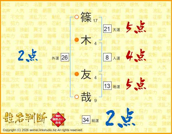 篠(17画)木(4画) 友(4画)哉(9画)