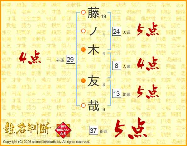 藤(19画)ノ(1画)木(4画) 友(4画)哉(9画)