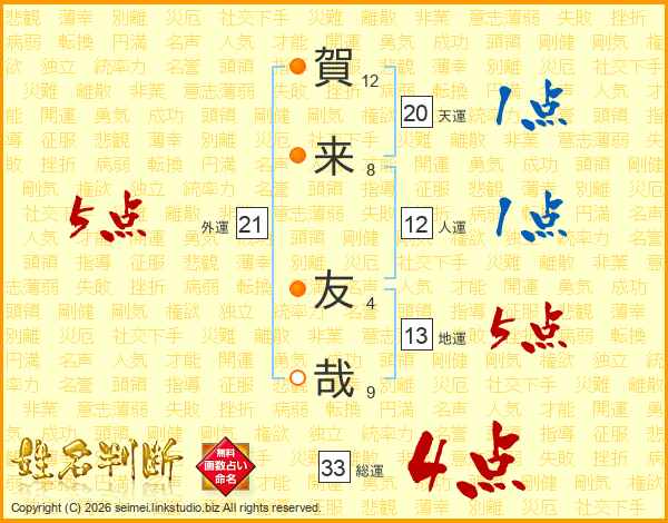生活面を象徴する運勢です。外部から受ける影響力を表し、結婚運、家庭運や職場、環境への順応性を表します。総運から人運を引いた画数。姓や名が1文字の場合を除く。