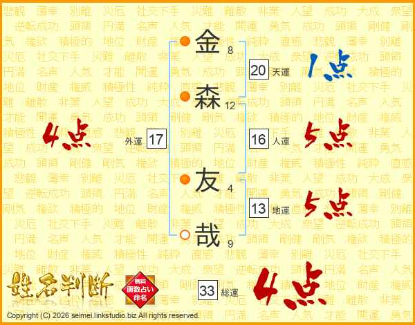 金(8画)森(12画) 友(4画)哉(9画)