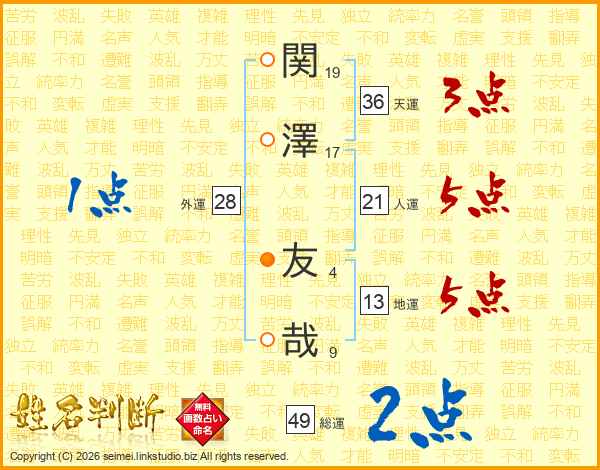 生活面を象徴する運勢です。外部から受ける影響力を表し、結婚運、家庭運や職場、環境への順応性を表します。総運から人運を引いた画数。姓や名が1文字の場合を除く。