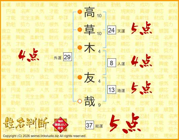 高(10画)草(10画)木(4画) 友(4画)哉(9画)