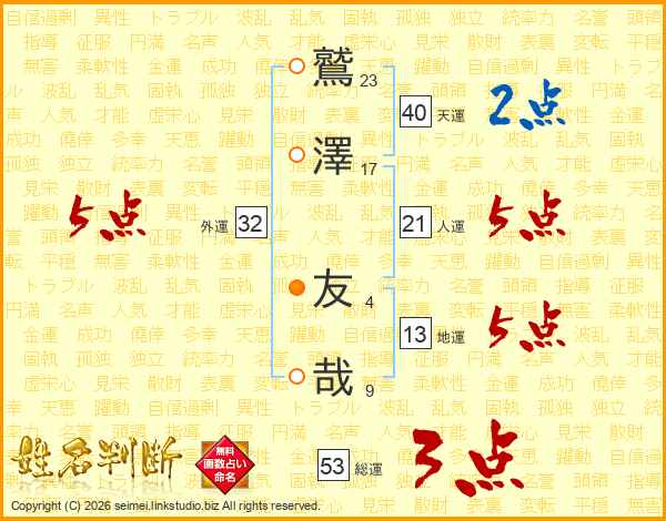 鷲澤友哉さんの天運は40画の2点!
