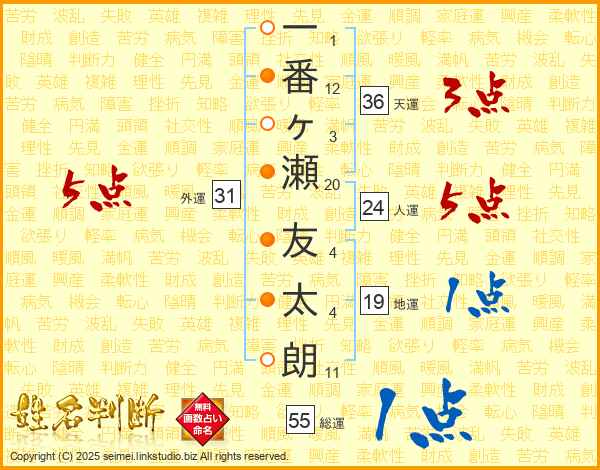 一(1画)番(12画)ヶ(3画)瀬(20画) 友(4画)太(4画)朗(11画)