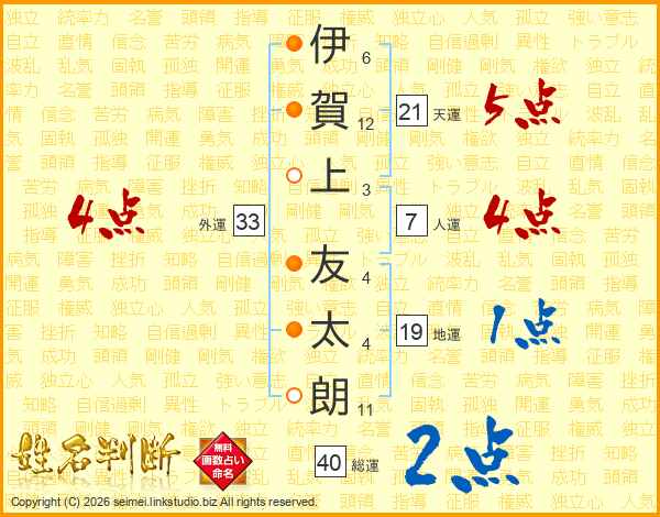 伊(6画)賀(12画)上(3画) 友(4画)太(4画)朗(11画)