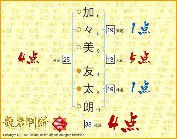 加(5画)々(5画)美(9画) 友(4画)太(4画)朗(11画)
