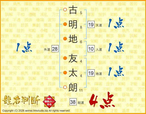 古(5画)明(8画)地(6画) 友(4画)太(4画)朗(11画)