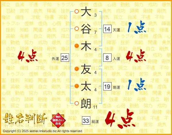 大(3画)谷(7画)木(4画) 友(4画)太(4画)朗(11画)