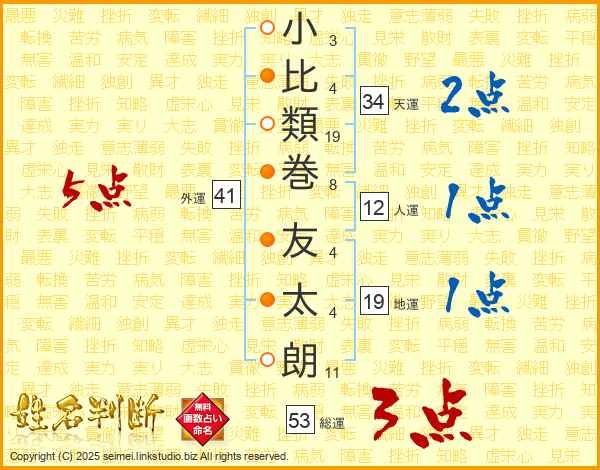 小(3画)比(4画)類(19画)巻(8画) 友(4画)太(4画)朗(11画)
