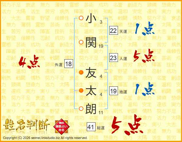 小(3画)関(19画) 友(4画)太(4画)朗(11画)